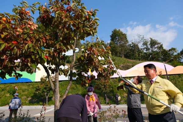 23일 군에 따르면 군은 이날 오후 3시에 용두공원 앞 감 가로수 길에서 정영철 영동군수를 비롯해 관내 기관단체장, 주민 등 50여명이 참여한 가운데 가로수‘감 따기’행사를 가졌다.