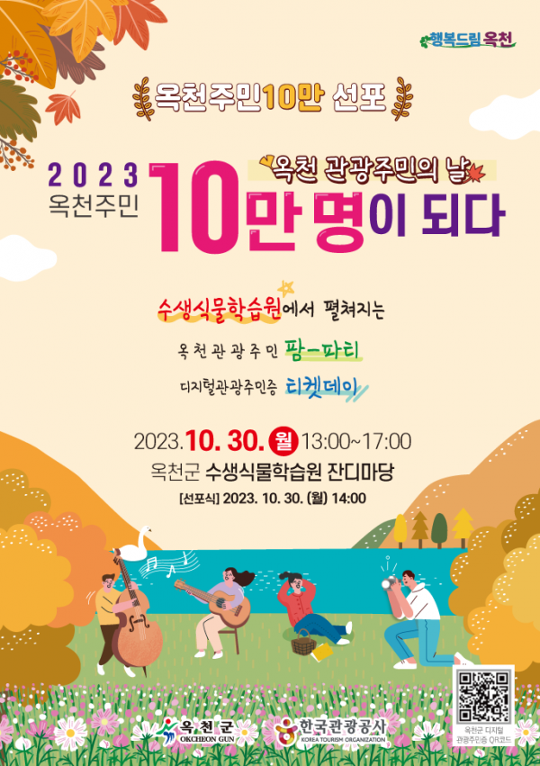 군은 그동안의 성과를 기념하고 지속적인 관광주민 유치 활동을 전개하고자 오는 10월 30일 한국관광공사 세종충북지사와 공동으로 수생식물학습원에서 ‘옥천주민 10만 선포식’을 개최한다.