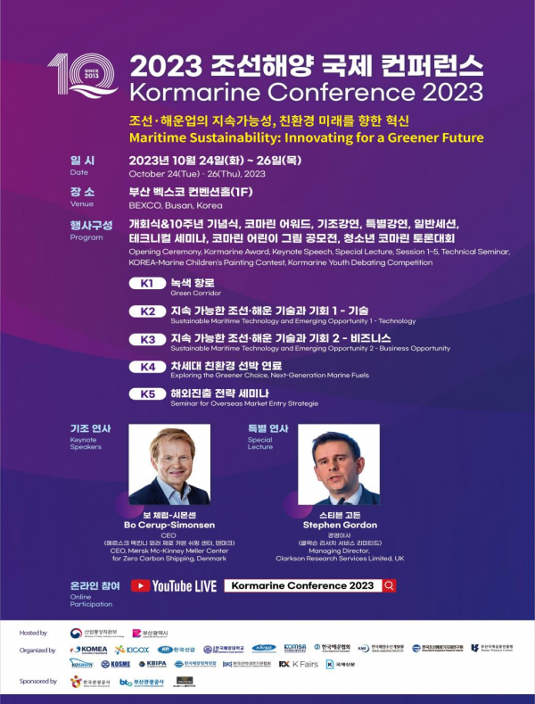 이번 행사는 부산시와 산업통상자원부가 공동주최하고 한국조선해양기자재공업협동조합이 주관하며 올해로 10주년을 맞이했다, 이번 컨퍼런스에서는 국내외 연사들을 포함한 1천여명이 참여하며 ‘조선·해운업의 지속가능성, 친환경 미래를 향한 혁신’을 주제로 친환경·디지털 변화에 따른 조선산업 변화의 흐름과 조선해양산업의 최신 경향을 짚어볼 예정이다 기조강연에는 보 체럽-시몬센 메르스크 맥킨니 뫼러 제로 카본 쉬핑센터 최고경영자가 연사로 나서며 스티브 고든 클락슨 리서치 서비스 리미티드 경영이사도 특별연사로 참여한다.