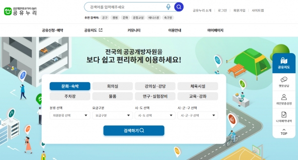 ‘공유누리’는 중앙행정기관, 지방자치단체, 공공기관이 보유한 시설이나 물품 등을 주민에게 개방하고 누구나 검색하고 예약할 수 있도록 행안부에서 운영하는 대국민 공공개방자원 공유서비스 포털이다.