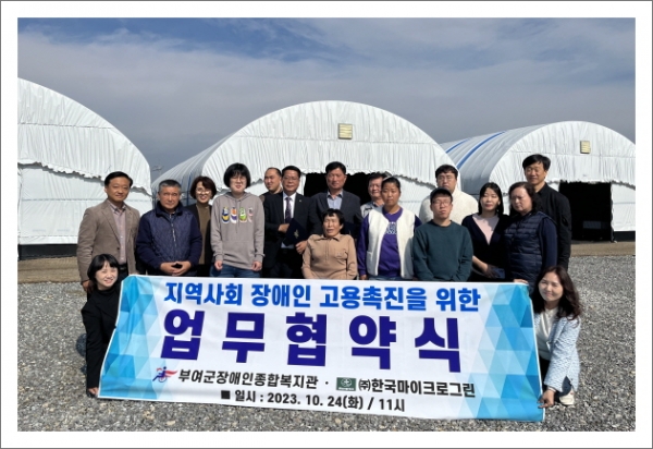[충청뉴스큐] 부여군장애인종합복지관은 지난 24일 지역 내 새싹전문기업 스마트 포그팜 ㈜한국마이크로그린과 사업장 현장에서 장애인고용 및 취업활성화를 위한 업무 협약식을 맺었다.