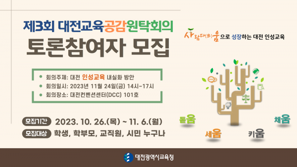 [충청뉴스큐] 대전광역시교육청은 11월 24일 오후 2시, 대전컨벤션센터에서‘대전 인성교육 내실화 방안’이라는 주제로 개최되는 ‘2023년 제3회 대전교육공감원탁회의’에 참여할 토론참여자를 모집한다고 밝혔다.