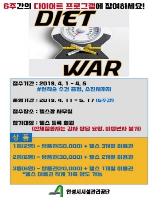 ‘다이어트 워’ 이벤트는 안성시국민체육센터 헬스장 등록 회원이면 누구나 신청 가능하고, 접수기간은 오는 4월 1일부터 4월 5일까지이며 운영기간은 4월 11일부터 5월 17일까지 6주간 진행된다.