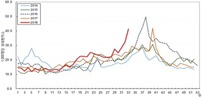 유행성각결막염 의사환자 분율은 2018년 33주 41.3명으로 전년 동기간 대비 166.5% 이며, 30주 이후 지속적으로 급격한 증가세를 보이고 있다.