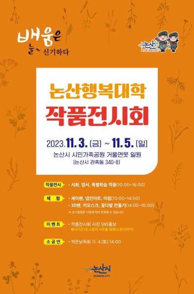 백성현 논산시장은 “많은 어르신들이 행복대학에서 연마하신 아름다운 글과 그림의 멋을 널리 선보이는 시간이 될 것”이라며 “이번 주말 논산으로 오시어 행복대학에서 전하는 따뜻한 에너지를 충전하시기 바란다”고 말했다.