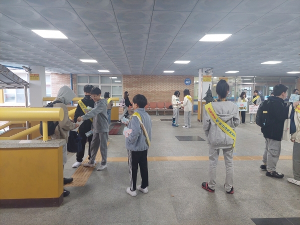 이날 캠페인은 등굣길 학생과 학부모를 대상으로 학생회 어린이들과 교직원이 함께 청렴교육을 홍보하는 팜플렛과 물티슈를 전달하며 진행됐다.