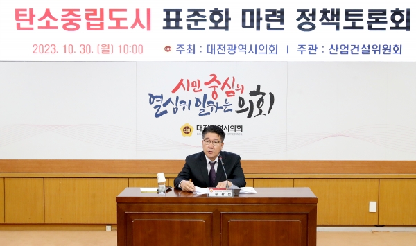 [충청뉴스큐] 대전시의회 산업건설위원회는 송활섭 의원 주재로 30일 대전시의회 소통실에서 ‘탄소중립도시 표준화 마련 정책토론회’를 개최했다.