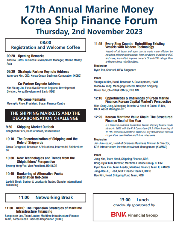 마지막 날인 11월 2일 마린머니의 '한국선박금융포럼'에서는 '해운시장과 탈탄소화 도전', '대한민국과 세계의 선박금융' 세션이 진행되며 해운시장의 검토 및 전망 등을 논의할 예정이다.
