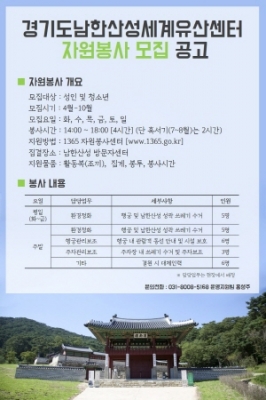 [충청뉴스큐] 경기도남한산성세계유산센터가 세계유산 남한산성 보호 등을 위해 오는 4월 2일부터 10월 31일까지 자원봉사자를 모집한다.