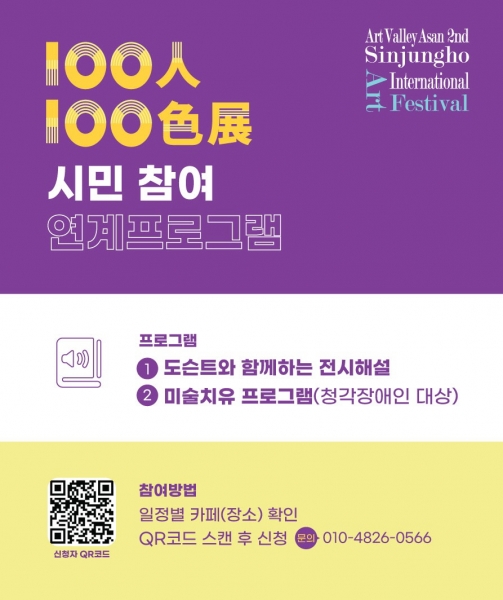 이번 시민 참여 연계 프로그램은 100인 100색전을 더욱 풍부하게 즐길 수 있도록 도슨트 작품 해설 프로그램, 미술 치유 프로그램, 음악공연 등으로 진행된다.