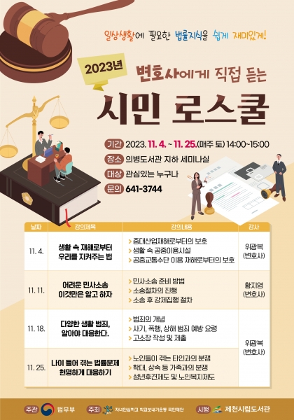 제천시립도서관은 올해 처음 사업에 선정되어 생활 재해, 민사소송, 생활 범죄, 어르신 법률 문제 대처 방법 등 일상에서 겪을 수 있는 법률 문제에 대해 총 4회 강연을 진행한다.