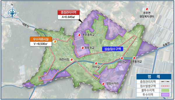 박범인 금산군수는 “추부면 마전지역의 피해를 예방하기 위해 이번 환경부 주관 하수도 정비 중점관리지역 선정에 노력을 기울였다”며 “군민 불안감을 해소하고 기후변화로 인한 국지성 호우 및 장마 등으로부터 군민 생명을 보호할 수 있도록 사업 추진에 만전을 기하겠다”고 말했다.