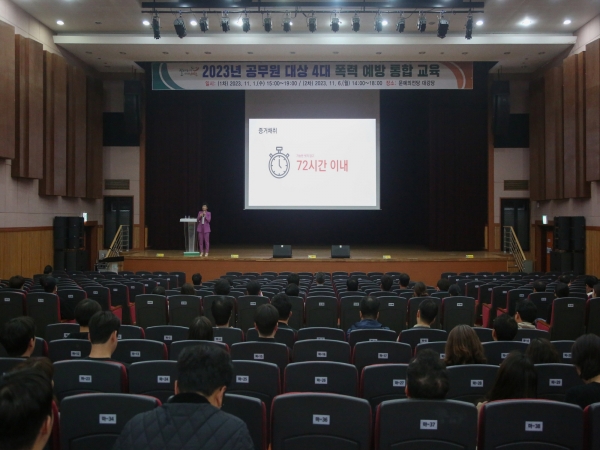 [충청뉴스큐] 서천군이 지난 1일 문예의전당 대강당에서 6급 이하 공무원, 신규직, 기간제 근로자, 사회복무요원 등 직원 400여명을 대상으로 ‘2023년 1차 공무원 대상 4대 폭력 예방 통합 교육’을 실시했다.