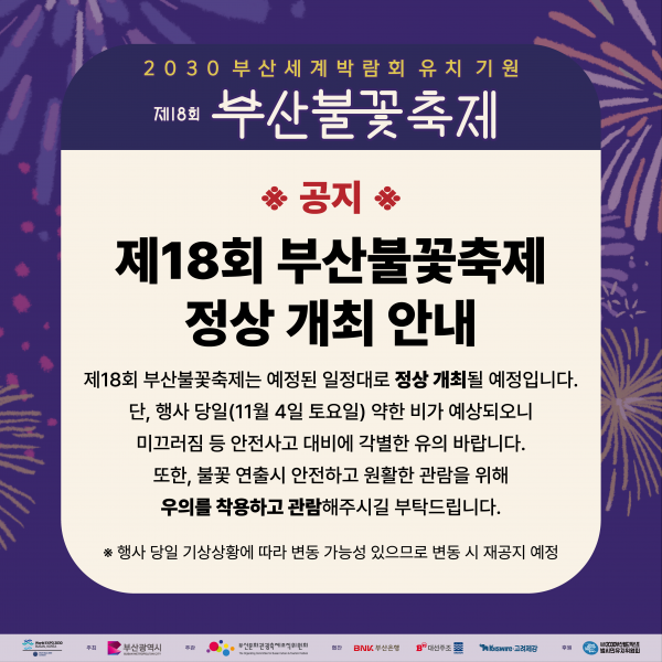 김경덕 부산시 시민안전실장은 “여러가지 기상 상황을 고려한 빈틈없는 안전대책을 마련해 안심하고 즐길 수 있는 부산불꽃축제를 만들겠다”며 “관람객 여러분들께서도 긴급재난문자 등 안내사항에 관심을 가져주시고 우산 대신 우의를 준비하고 미끄러짐 등 안전사고에 각별히 유의하시길 부탁드린다”고 전했다.