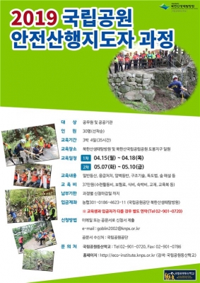 [충청뉴스큐] 환경부 산하 국립공원공단은 서울 도봉구 북한산생태탐방원 국립공원 등산학교에서 진행하는 2019년 국립공원 안전산행지도자 참가자를 25일부터 모집한다.