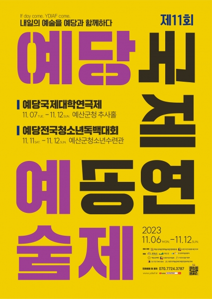 11월 6일 개막식에서는 ‘맹진호와 건아들&비보이 콜라보’ 공연을 시작으로 해외 및 국내 초청공연, 예당국제대학연극제, 예당전국청소년독백대회가 펼쳐지며 12일 폐막식에서는 ‘최성웅의 품바’ 공연이 진행될 예정이다.
