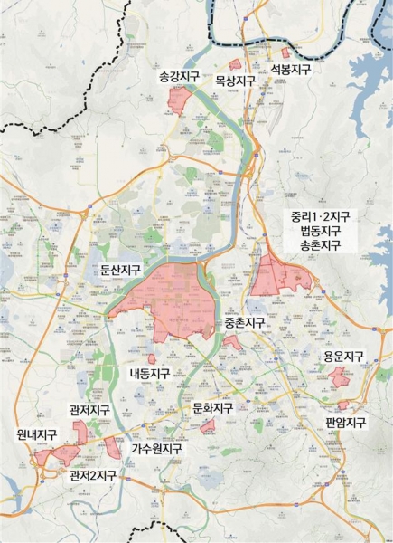 용운, 판암 송강, 원내 중촌, 문화 둔산, 내동, 가수원, 관저1,2 중리1,2, 법동, 송촌, 석봉, 목상 대전시는 지난 2월 도시계획 전문가를 총괄 계획가로 위촉해 대상지구의 현장답사와 기초자료를 분석해 왔고 도시계획 정비 및 아이디어 발굴을 위해 분야별 전문가를 구성해 전문가 자문회의를 진행해 왔다.