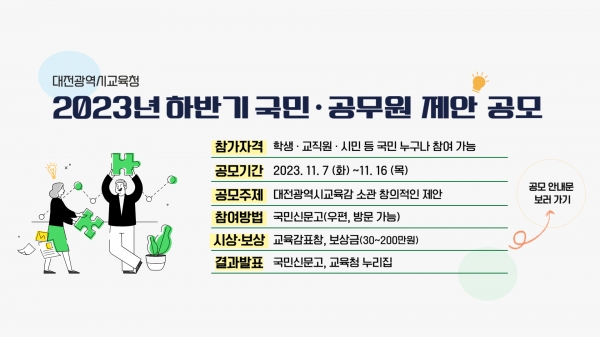 [충청뉴스큐] 대전광역시교육청은 11월 7일 ~ 16일까지 학생·시민·공무원 등 전 국민을 대상으로 2023년 하반기 국민·공무원 제안 공모를 실시한다고 밝혔다.