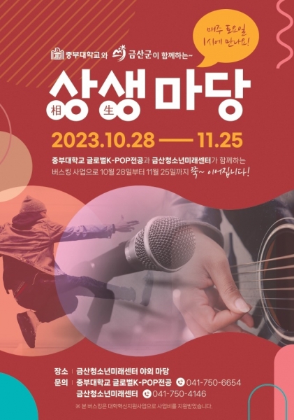[충청뉴스큐] 금산군과 중부대가 함께하는 문화·예술 공유 프로젝트 ‘금산군 K-POP 나눔 행사, 상생마당’이 인기를 얻고 있다.