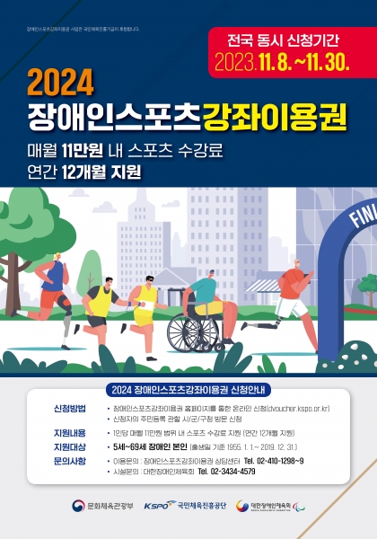 사업 신청은 8일부터 11월 30일까지 스포츠강좌이용권 홈페이지와 장애인스포츠강좌이용권 홈페이지에서 할 수 있으며 인터넷 사용이 어려운 대상자는 기간 내 주민등록상 관할 행정복지센터를 방문해 서면 신청하면 된다.