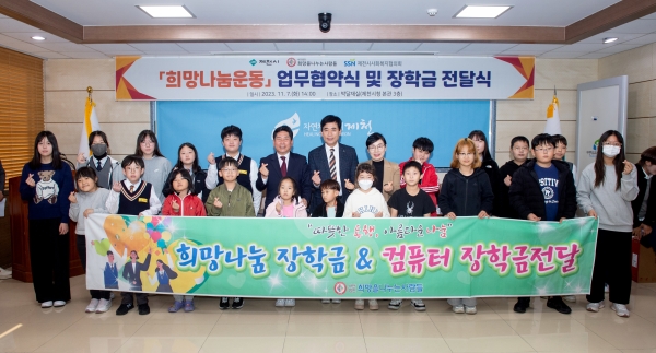 이날 협약식에는 김창규 제천시장과 희망을 나누는 사람들 김정안 회장, 제천시사회복지협의회 양순경 회장이 참석해 업무협약을 체결한 데 이어 23명에게 장학증서를 전달했다.