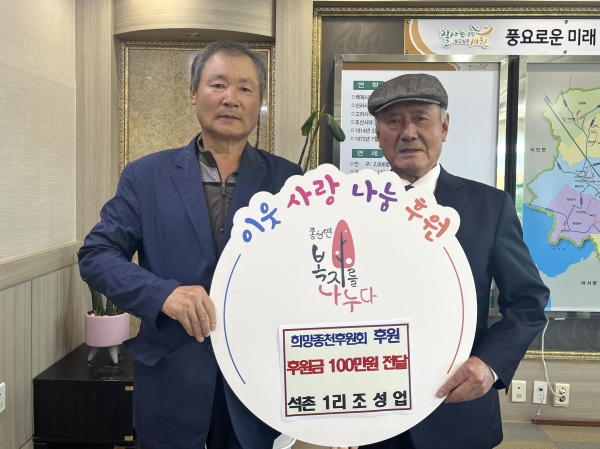 [충청뉴스큐] 서천군 종천면 석촌1리 주민 조성업 씨 가 지난 8일 희망종천후원회에 관내 어려운 이웃을 위해 써달라며 100만원의 후원금을 전달했다.