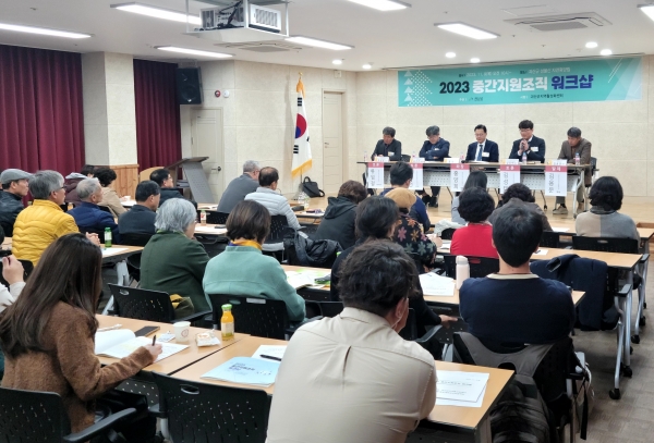 이날 워크숍에는 괴산군 도시재생지원센터 등 괴산군 내 중간지원조직 9개 기관과 괴산군 지역 14개 사회단체의 임원, 2023년 시군역량강화 프로그램 참여 30개 동아리 단체 회장 및 임원, 괴산군 11개 읍면 농산어촌개발사업 완료지구 운영위원장 및 임원 등 100여명이 참석했다.