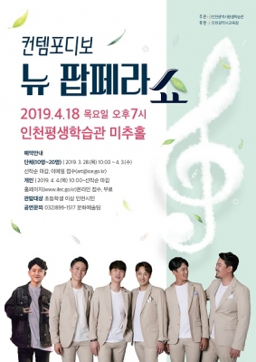 [충청뉴스큐] 인천평생학습관 은 오는 4월18일 저녁 7시 미추홀에서 ‘컨템포디보의 뉴 팝페라 쇼(New Popera Show)’를 개최한다고 밝혔다.