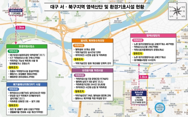 한국환경공단 악취실태 조사 결과를 바탕으로 2019년부터 시범적으로 실시하던 노후 대기오염방지시설 교체사업을 2021년부터 염색산단과 서대구산단 노후 대기오염방지시설을 전면 교체하기 위해 ‘광역단위 노후 대기오염방지시설 설치 사업’을 집중 추진해 100개소 519억원을 투입하고 2024년까지 사업을 최종 완료할 예정이다.