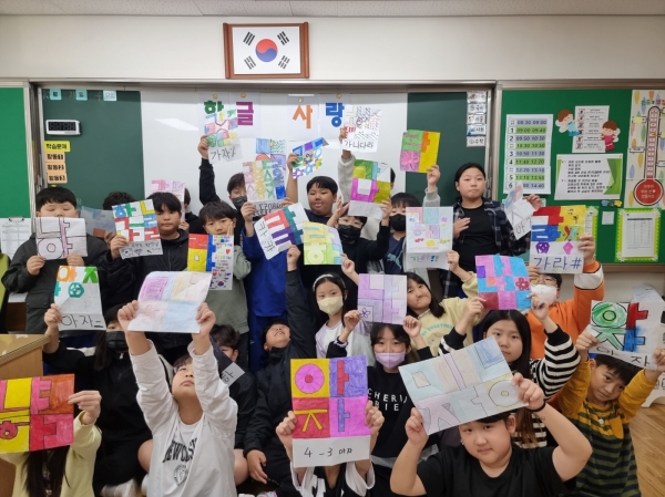 미술 활동과 수학 수업을 연계해 만든 노랫말 한글로 글자 꾸미기 수업에 귀여운 율동을 추가한 노랫말 한글을 더욱 사랑하겠다는 마음을 담은 노랫말 노래 선정부터 반주, 안무까지 함께 참여해 직접 만든 손수 제작물까지 우리 아산 관내 학생들의 아름답고 순수한 마음이 표현된 작품들이 응모됐다.