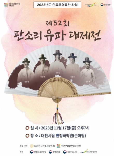 [충청뉴스큐] 대전시립연정국악원은 한국판소리보존회와 공동주최로‘판소리 유네스코 인류무형문화유산 등재 20주년’을 기념해 ‘판소리 유파 대제전’을 17일 19시 국악원 큰마당에서 개최한다.