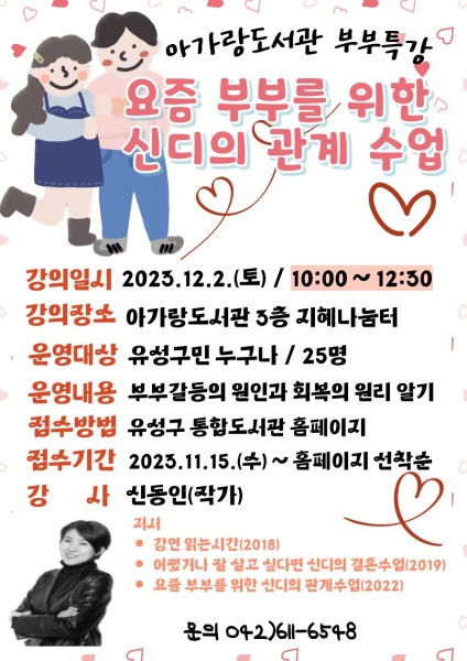 [충청뉴스큐] 대전 유성구는 12월 2일 임신·출산·육아 특화도서관인 아가랑도서관에서 부부특강‘요즘 부부를 위한 신디의 관계수업’을 운영한다고 밝혔다.