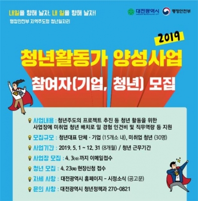 [충청뉴스큐] 대전시는 2019년 청년활동가 양성사업에 참여할 사업장과 청년을 모집한다고 26일 밝혔다.