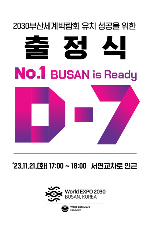 우선, 오는 11월 21일 오후 5시 서면교차로 일원에서 부산시와 부산시의회 주최, 범시민유치위 시민위원회, 범시민서포터즈, 범여성추진협의회, 시민참여연합의 공동 주관으로 '2030부산세계박람회 유치 성공을 위한 출정식'을 개최한다.