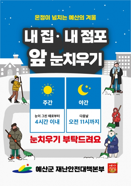 [충청뉴스큐] 예산군은 11월 15일부터 2024년 3월 15일까지 4개월간 ‘겨울철 자연 재난 대책기간’으로 정하고 대설·한파 등 겨울철 재난 피해 최소화를 위해 총력 대응에 나선다.