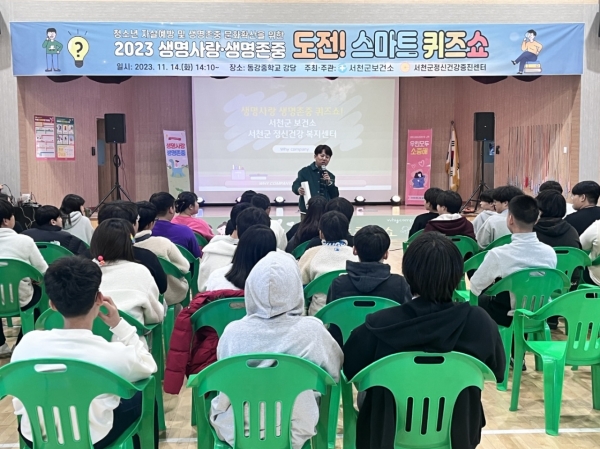 지난해 군은 서천초등학교 학생들을 대상으로 생명사랑·생명존중 스마트 퀴즈쇼를 진행했으며 설문조사 결과 만족도 89.9% 자살 예방에 대한 인식도 10% 이상의 개선율을 보인 바 있어 올해 대상을 중학생으로 확대했다.
