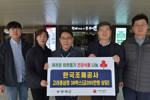 군 관계자는 “부여군 군민들을 위해 여러 나눔을 실천해주시는 부여군 한국조폐공사 제지본부 직원들에게 감사 인사를 드린다”며 “기탁해주신 홍삼정은 필요한 이웃들에게 잘 전달될 수 있도록 하겠다”고 감사 인사를 전했다.