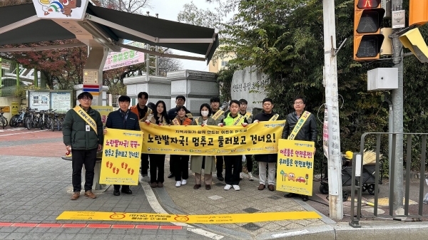 [충청뉴스큐] 대전시 지역문제해결플랫폼은 16일 신탄진 용정초등학교 주변에 어린이 교통사고 예방을 위한‘노란발자국’을 설치하고 교통안전캠페인을 벌였다.
