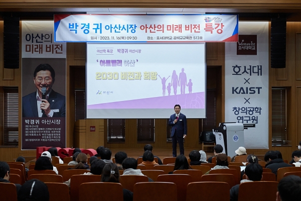[충청뉴스큐] 박경귀 아산시장이 11월 16일 호서대학교 아산학 교양강좌 수강생을 대상으로 특강을 진행했다.