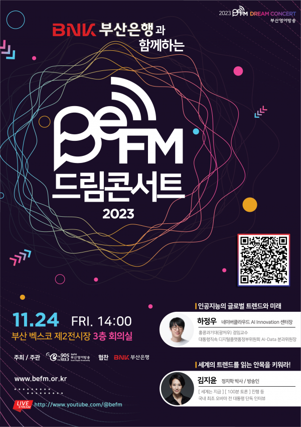 부산시와 부산글로벌도시재단은 오는 24일 오후 2시 벡스코 제2전시장에서 'BNK 부산은행과 함께하는 2023 BeFM 드림콘서트'를 개최한다고 밝혔다.