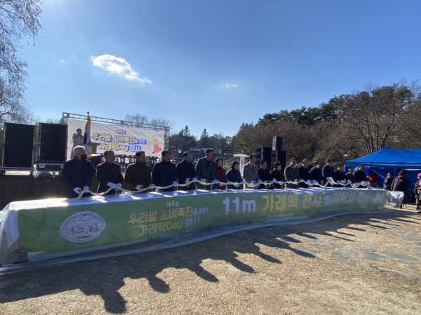 행사는 제천시 농민회 주관으로 우리쌀의 맛과 우수성을 알리기위해 삼색 가래떡 11m 커팅식과 시민들에게 떡메치기, 인절미 만들기 체험 및 가래떡 증정 캠페인을 진행했다.