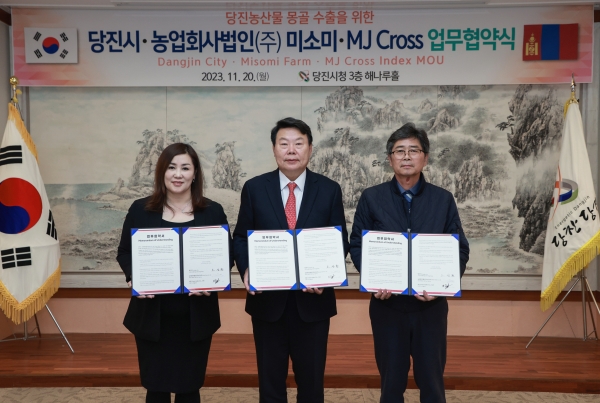 [충청뉴스큐] 당진시와 농업회사법인미소미, 몽골 MJ Cross사가 20일 당진시청 해나루 홀에서 당진특화‘아미쌀’과 당진농산물 몽골 수출 확대를 위한 업무협약을 가졌다.