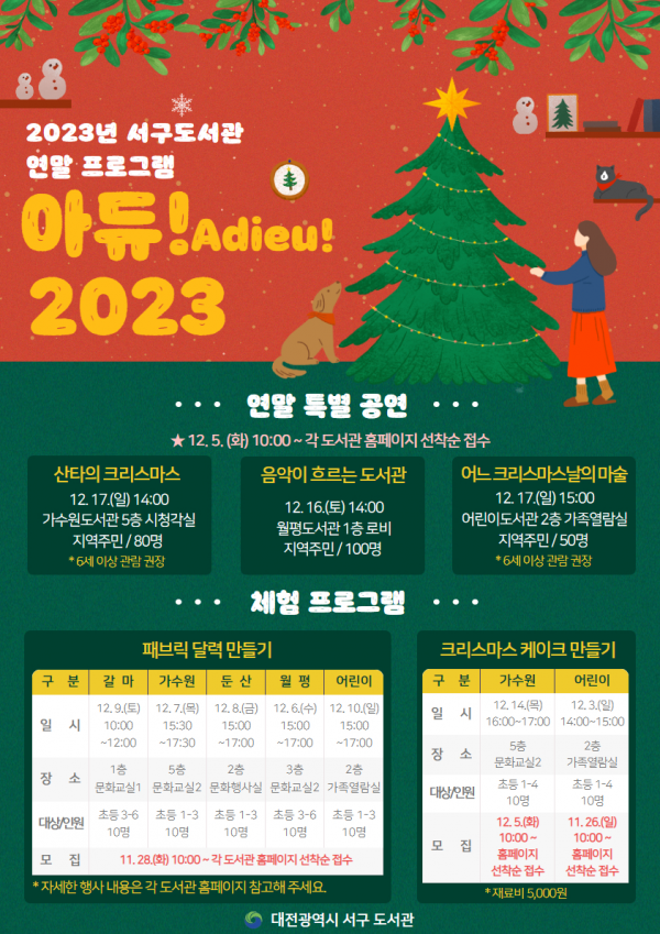 [충청뉴스큐] 대전 서구 5개 공공도서관은 연말 프로그램으로 ‘아듀 2023’을 운영한다고 21일 밝혔다.