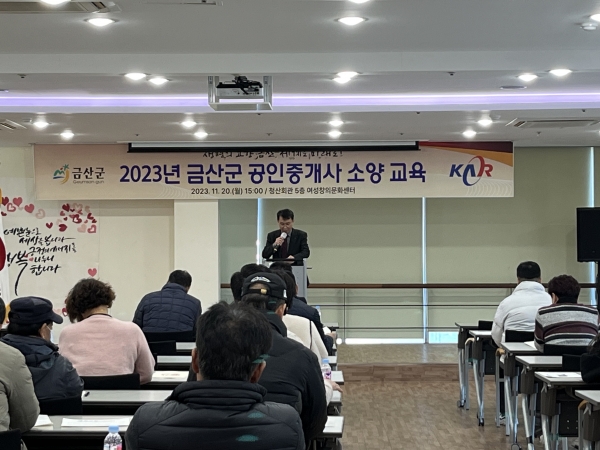 [충청뉴스큐] 금산군은 지난 20일 금산읍 청산회관 여성창의문화센터에서 건전하고 투명한 부동산거래 질서 확립을 위해 공인중개사 소양 교육을 시행했다.