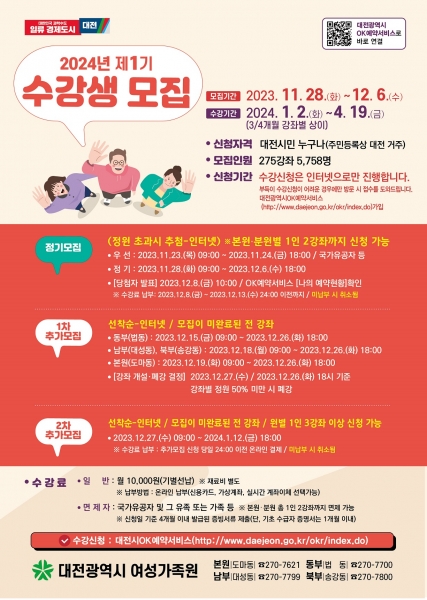 [충청뉴스큐] 대전여성가족원은 28일 오전 9시부터 12월 6일 오후 6시까지 9일간 2024년 제1기 강좌 수강생 5,758명을 모집한다.