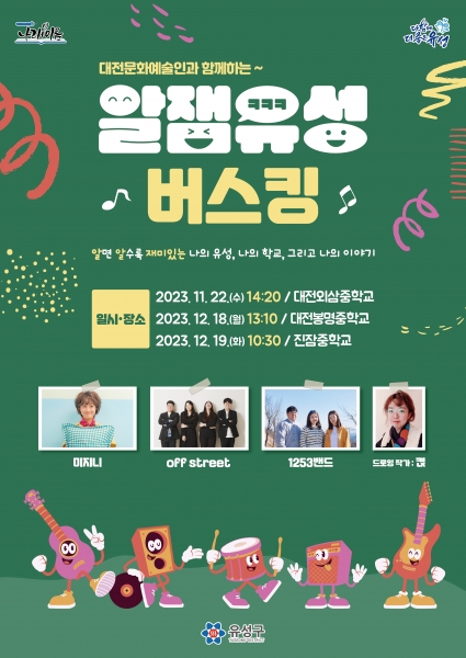 ‘알잼유성버스킹’은 대전의 문화예술인과 협업해 유성의 마을이야기를 담은 교육 콘텐츠를 공연으로 기획했으며 외삼중학교 봉명중학교 진잠중학교 등 총3회로 나눠 진행한다.