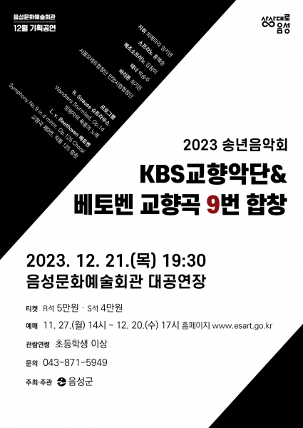 이번 공연은 대규모 합창단과 오케스트라가 함께하는 장엄한 클래식 공연으로 슈트라우스의 합창곡 ‘방랑자의 폭풍의 노래’ 베토벤 교향곡 제9번 작품번호125 ‘합창’을 연주해 2023 송년을 맞이하는 음성군민들에게 깊은 감동의 시간을 선사할 예정이다.