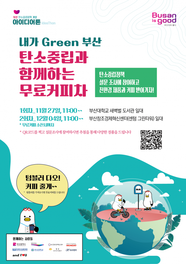 [충청뉴스큐] 부산시는 오는 11월 27일 부산대학교에서 12월 4일 센텀시티 빌딩가에서 '내가 Green 부산, 탄소중립과 함께하는 무료커피차'를 운영한다고 밝혔다.