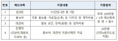 생활문화동아리의 예산 지원은 강사비, 홍보비, 대관비로 3개 중 1개만 선택 가능하며, 홍보비와 대관비를 신청하는 동아리는 20만원의 진행비를 별도로 인천e-음카드로 지급한다.