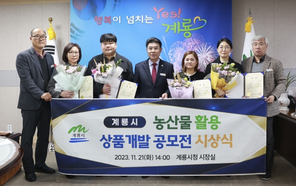 농산물 활용 상품개발 공모전 선정 우수업체 수상 모습(가운데 이응우 시장)(사진=계룡시)